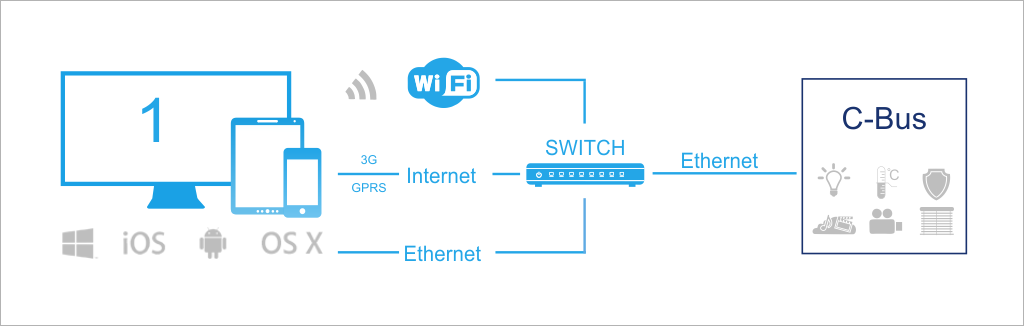 Control of C-Bus system is possible via CNI Ethernet interface or С-Gate.