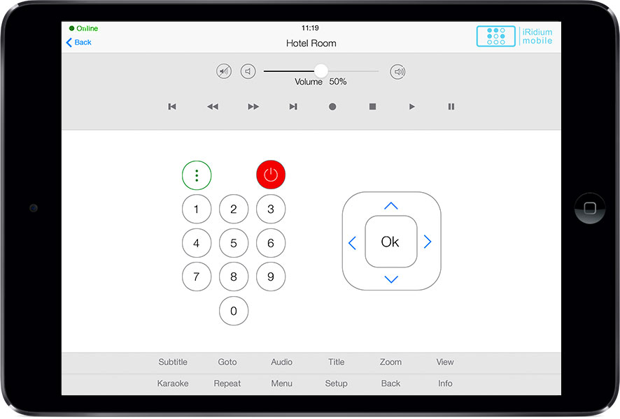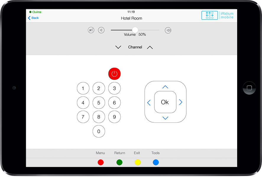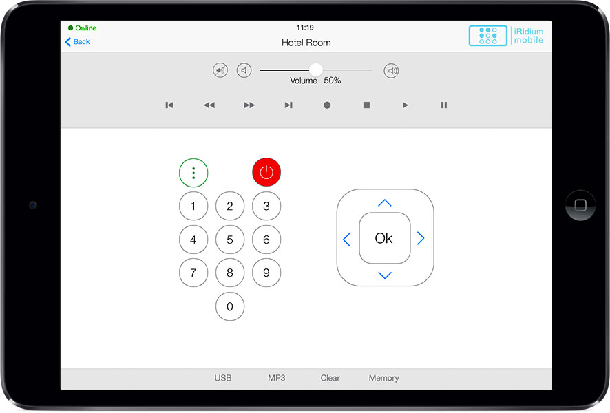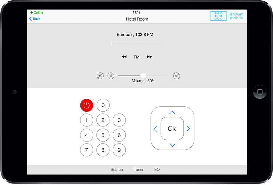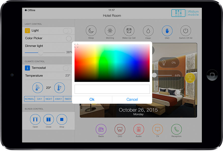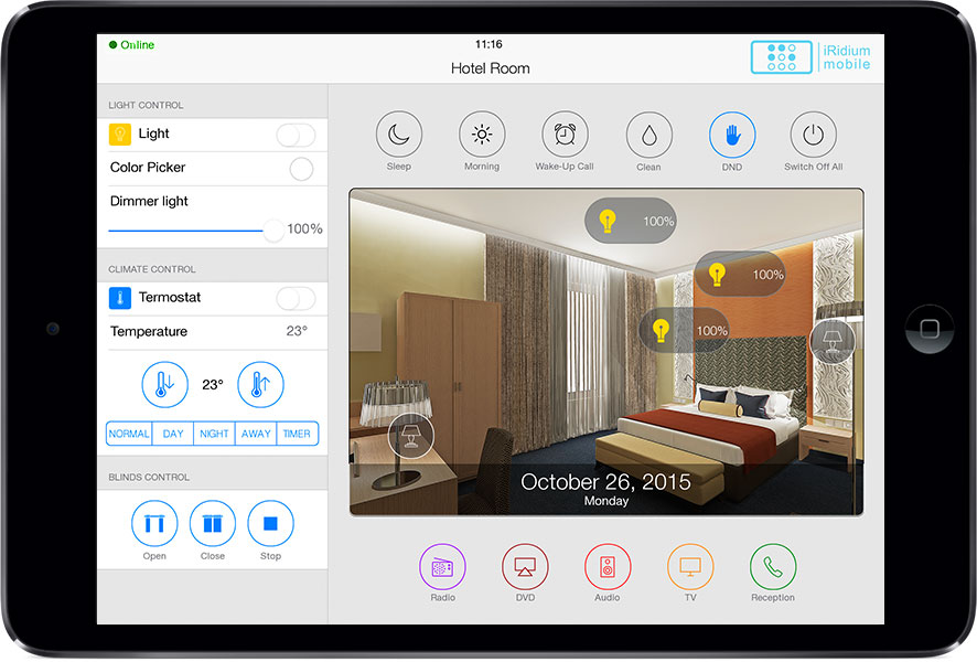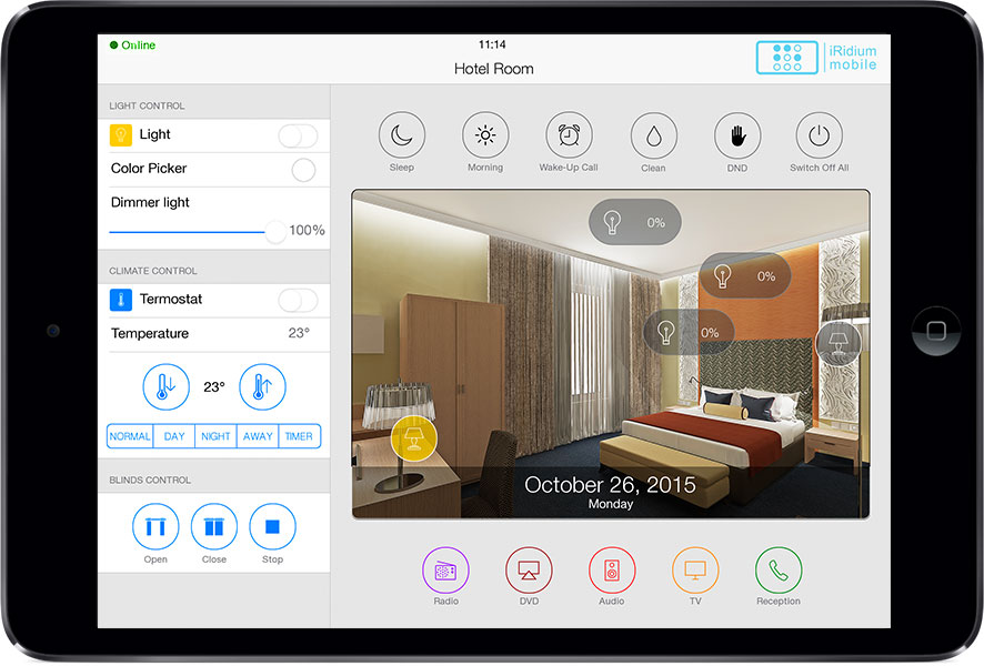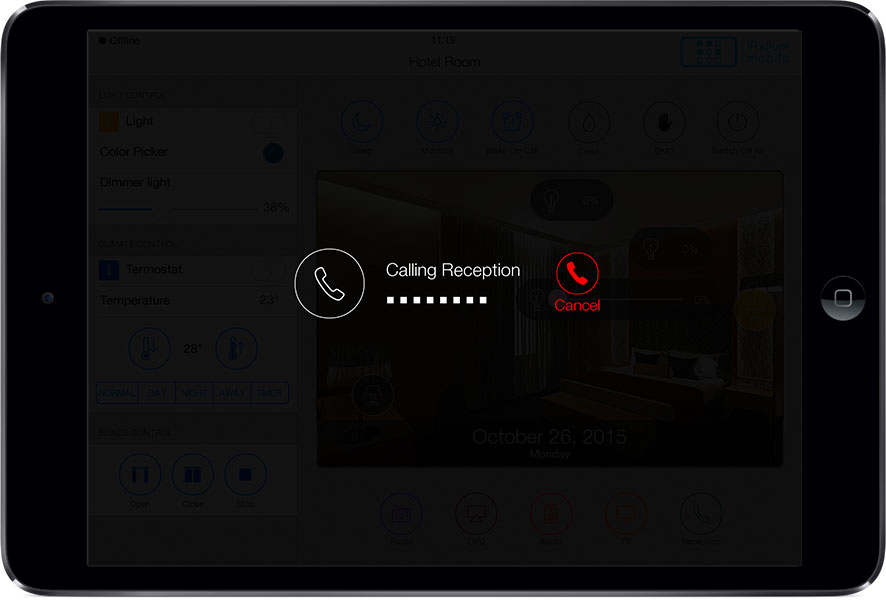 The interface can control all automation and A/V equipment of a hotel, as well as to use some of the hotel services: Call the Reception (right from the interface), Clean the room, Wake-up call, DND .