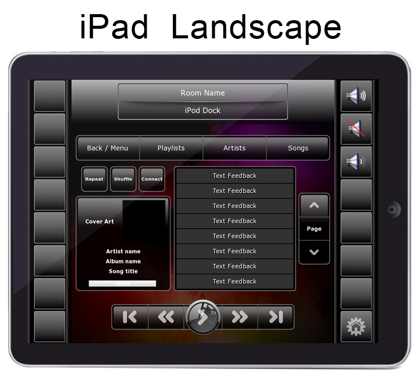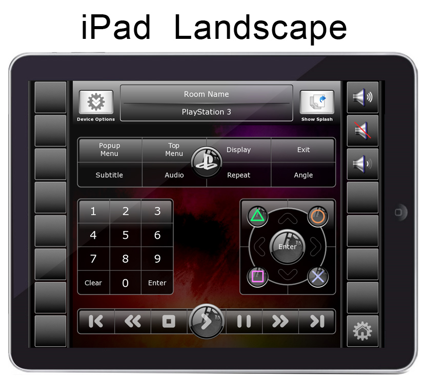 Pages: Apple TV, Cable/Satellite, Favorite Channels, CD Changer, FM Tuner, DVD/Blu Ray, Climate, Lighting , Media Server, PlayStation 3, Projector, Satellite Radio, Tivo DVR, TV Control, Wii, Wii U, XBOX360, Security Keypad, Confirm Shut Down, Room Select, Home Page, etc.
