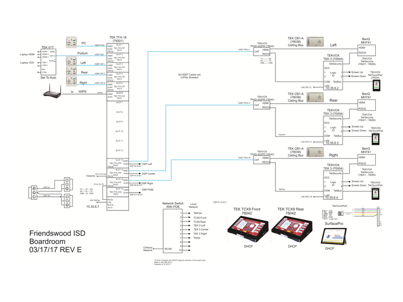 The system is designed to be a decentralized control system allowing each touchscreen controller to independently operate the system. Unlike other systems using a central control system where all devices are controlled by a single controller, anyone of the touchscreen controllers can operate the system by themselves. This allows the touchscreen controller to have the same program and if any of the touchscreen controllers fail there are still two others that can operate the room. For simple operation of the system, a small touchscreen called a TekTouchPad is mounted at each projector.