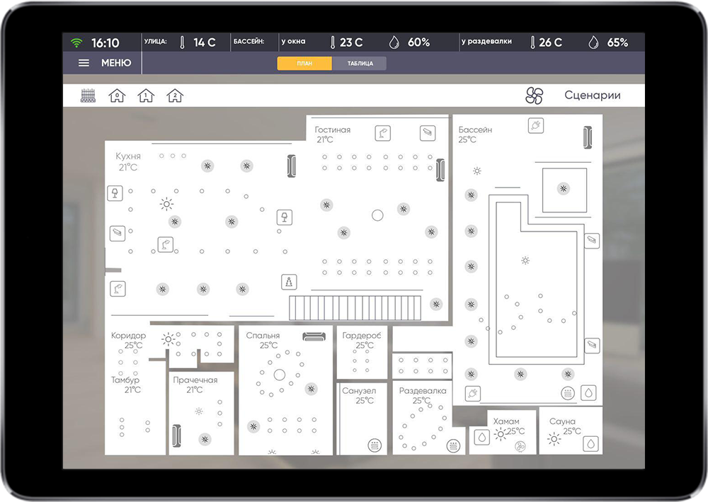 Complicated logics of climate control is realized that allows to control temperature and humidity by zones in rooms.