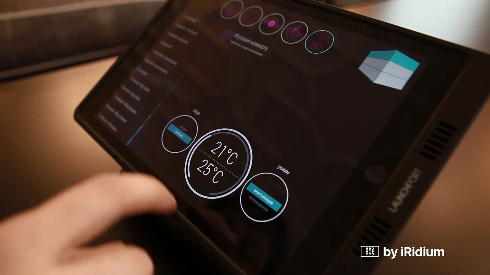 It’s a free-floor house in Almaty. Smart home system was installed in 33 rooms: 6 bedrooms and bath-rooms, a study, a fireplace lounge, a play room, a kitchen, a dining room, a swimming-pool, a gym and a home cinema. Lighting is also controlled on the territory surrounding the house. 4 iPads Air are used to control: 2 wall-mounted iPads on each of the living floors and 1 iPad is not fixed anywhere, 1 iPad is used to control the home cinema.
