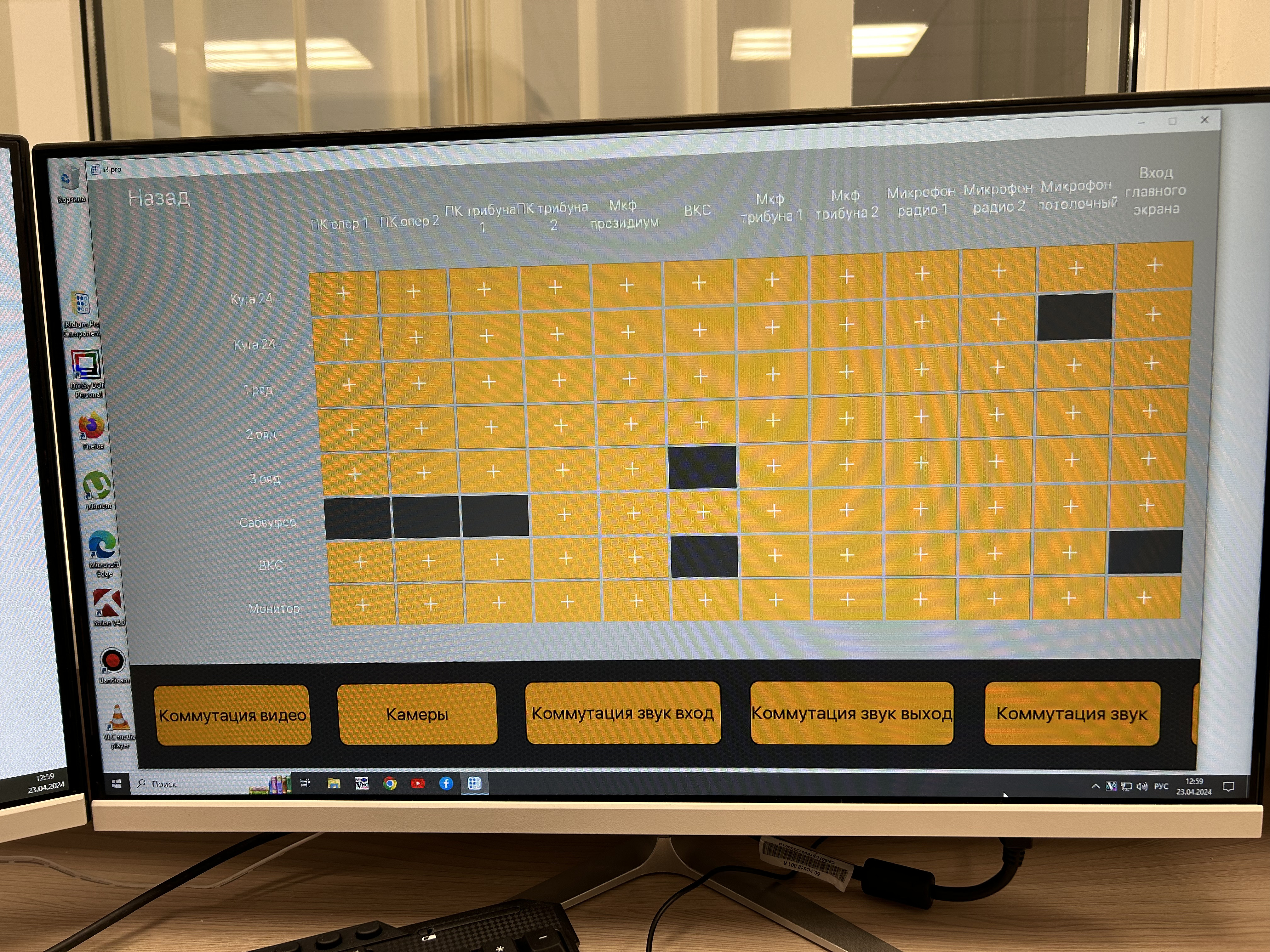 ✔️ использован матричный коммутатор CPLUS-V8H8HPA для гибкого распределения видеосигналов между дисплеями, включая моторизованные LCD-панели Wize WR-17GF для президиума, светодиодным экраном и интерактивной трибуной;