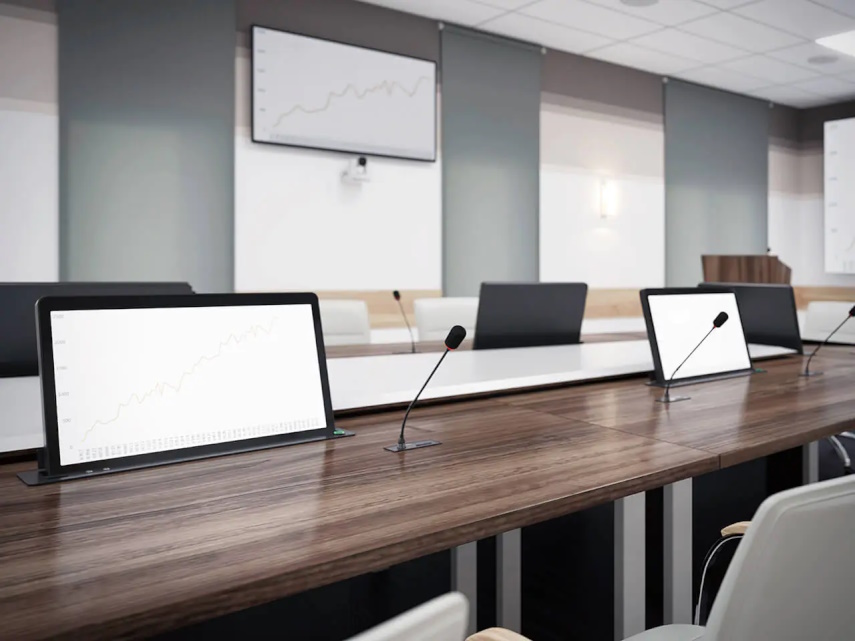 ✔️ Для руководителя организована возможность одновременного просмотра четырех различных источников видео: активный докладчик ВКС, общая сетка галереи ВКС, обсуждаемый документ или презентация и документ личного пользования (план и повестка). Два из них отображаются на основном экране и два – на персональном сдвоенном мониторе.