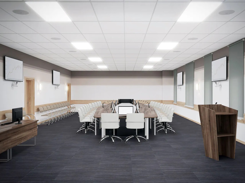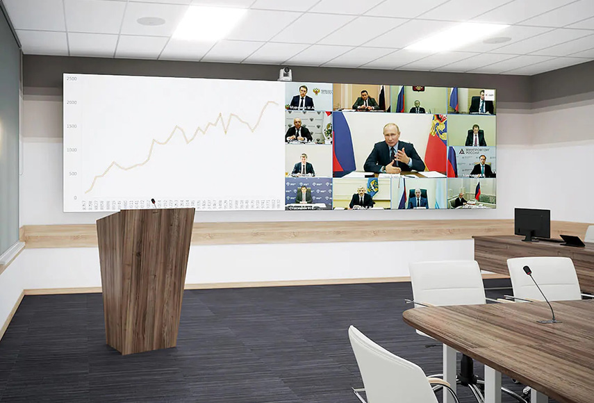 ✔️ Пять поворотных IP-камер Lumens VC-A61PW с 30-кратным оптическим зумом и разрешением 4K, установленные по периметру зала над системами отображения, и видеотерминал нового поколения Yealink MeetingEye 800 с поддержкой видеозвонков в режиме «двойной 4K».