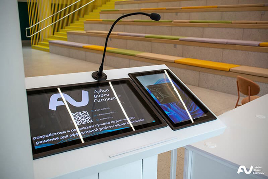 ✔️ Мобильная трибуна, оснащенная ПК для презентаций, микрофоном ClockAudio на гибкой стойке типа «гусиная шея» и двумя встраиваемыми сенсорными мониторами.