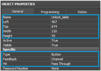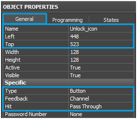 5.1. Create an item, name it Unlock_button and set the following parameters in Object Properties / General.
