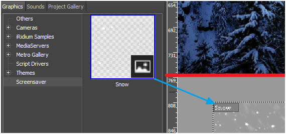 3.4. Now we have item Snow in Screensaver folder. To add an item from the Gallery to the page as a new item, drag and drop it to the free working area of Screensaver page.