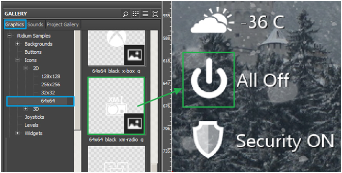 To add different hot keys (for quick access to functions of smart home), use icons in Gallery / Graphics / iRidium Samples / Icons / 64x64.