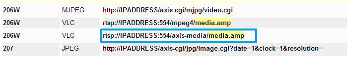 We found a link for AXIS 206W camera to a H.264 / mpeg4 stream via RTSP