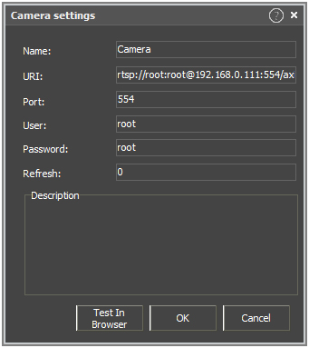 If you want only authorized access to your camera with a name and a password, fill in the fields User and Password. The standard user name and password are given in the camera manual. For our Axis 206W camera the standard user name and password are: root. After filling in User and Password fields, the URI field has changed and now it is: