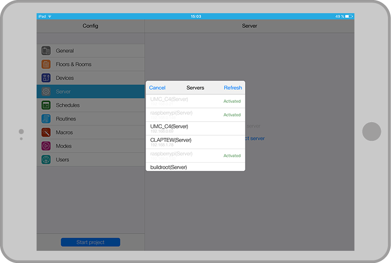After setting up a voice control module, a user has to find iRidium server in the local net and connect it to the project. To add a server, you have to click servers button in the main window of the configuration section. A window for searching a server in the local net will be opened. You have to wait for the end of searching and select the required server and add it to the project.
