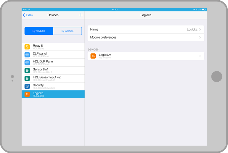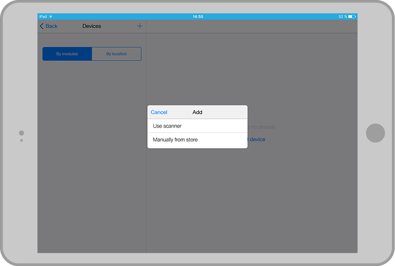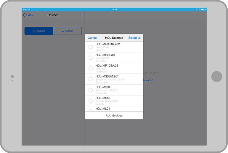 Window “List of devices” is used for displaying and configuration of modules for controlling smart home devices. If devices are not added into the project, you have to click the button “Add device” to open a search window.