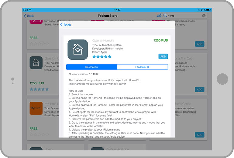 After downloading modules for controlling equipment, you have to open iRidium store and find a voice control module. To download it, click the Add button.