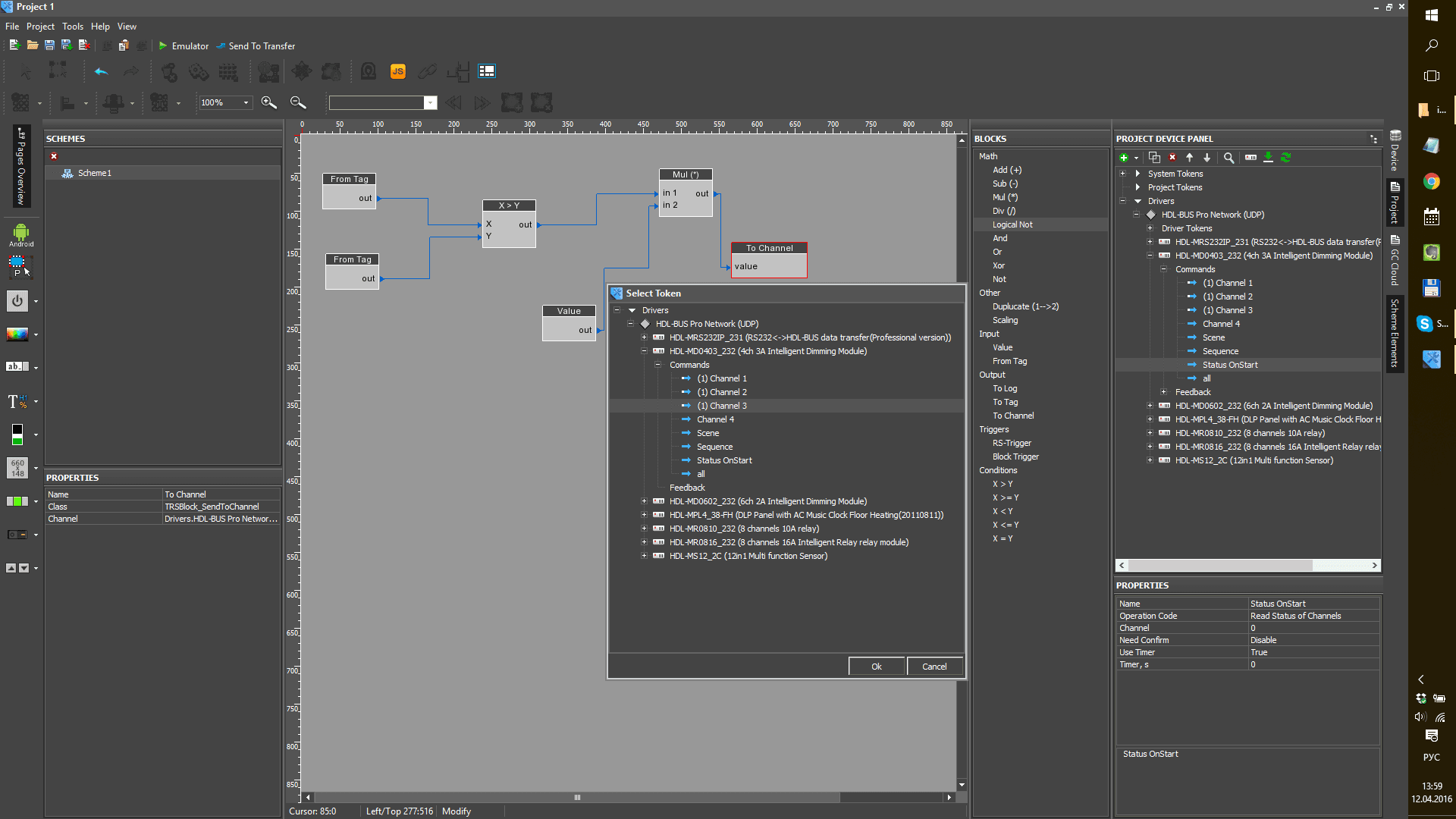 The built-in drivers just like the interface are set up in iRidium studio. They are standardized, have detailed documentation and examples. Work with such drivers is easy and fast. For example, channels for control of KNX equipment are added with the help of project import from ETS and channel for control of HDL equipment are added with the help of the scanner. After adding the channels you need to input the settings for connection and the driver is ready for use in your project. Import and scanner functions are also available for Crestron, Modbus, Clipsal, BACnet, Duotecno, Domintell drivers.