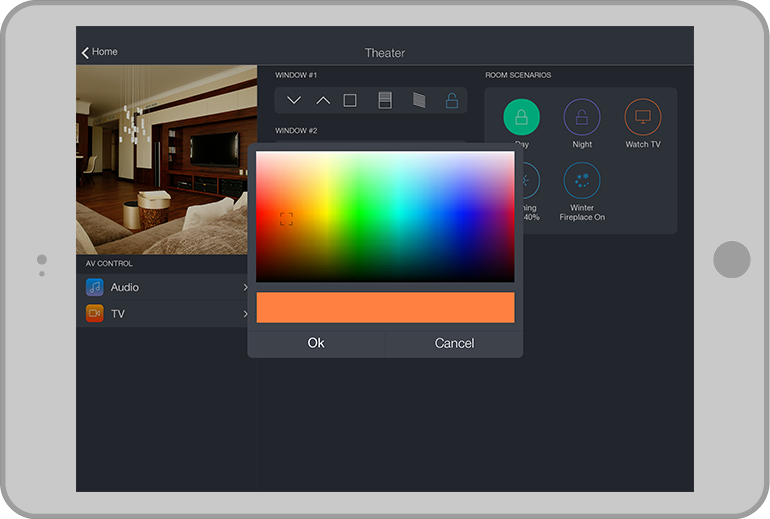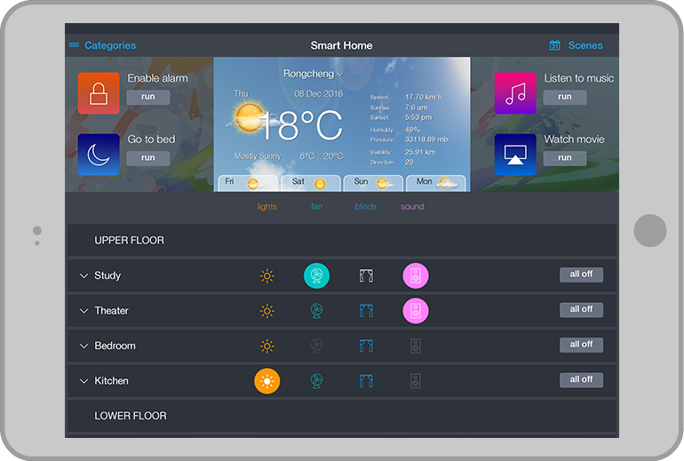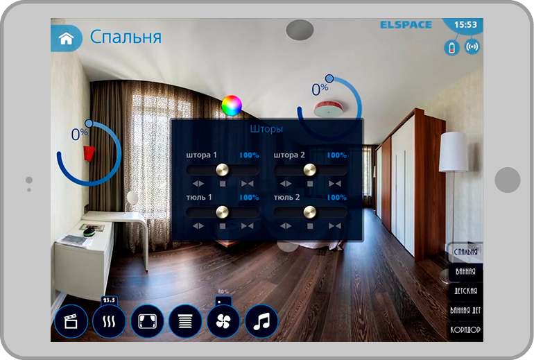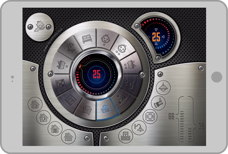 The interface is formed in iRidium studio and consists of control items, images, sounds and popups with hide and show effects. You can create a project in horizontal or vertical orientation for your tablet or phone. You can create a turning interface, set up changing its pages by swipe and many other things.
