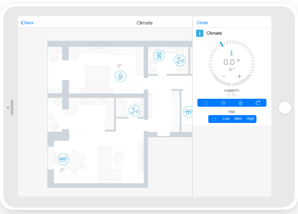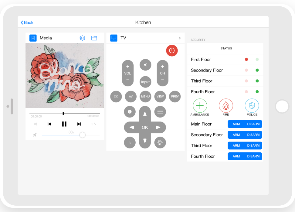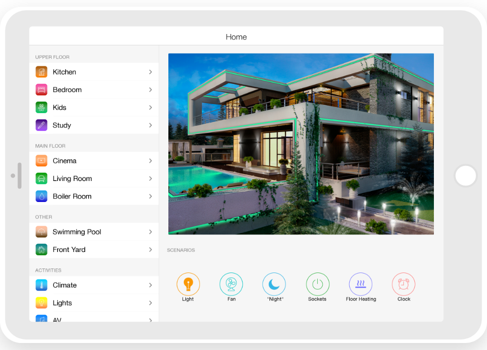 Control: light. blinds, cameras, climate, control of Audio/Video equipment, scenes.