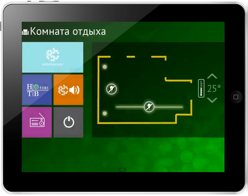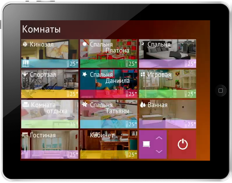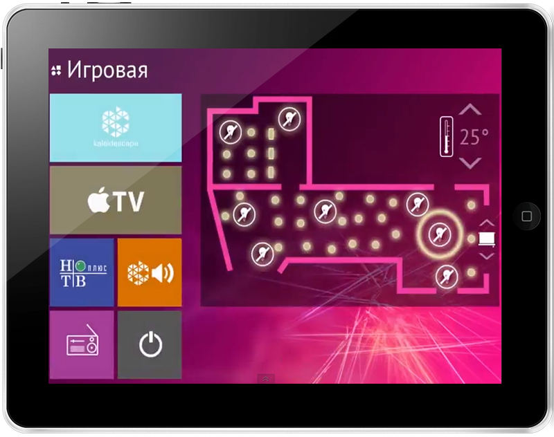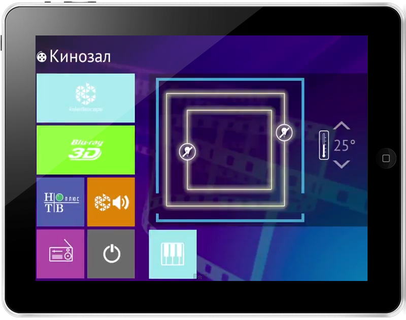 On the first stage we successfully implemented control of Home Theatre. We also implemented the multi-room system in the gym and lounge and automated lighting control. As all added rooms don’t have natural daylight the lighting control was implemented there on the basis of presence sensors. For that the client provides us with the required equipment which was installed in the server room. So by the end of the first stage we created a separate automation system of added rooms without any connection with the existing automation system of the flat. It was decided to use Apple iPads with installed iRidium as control panels.