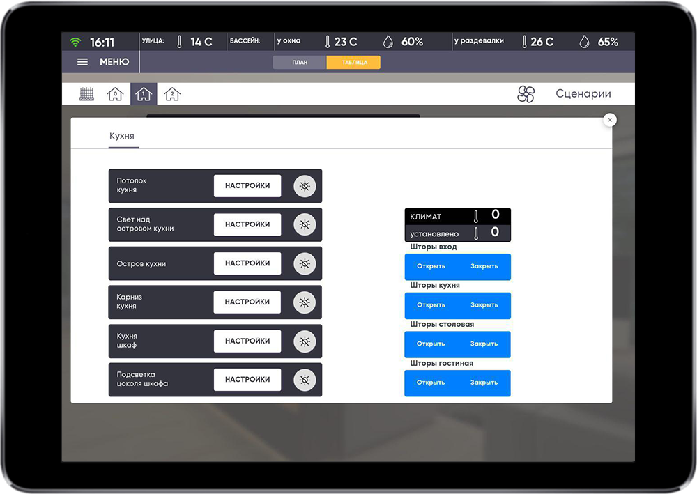 The project also features complicated multi-level security system of the house and the territory. It is included in the upper-level automation system and used in scenes.