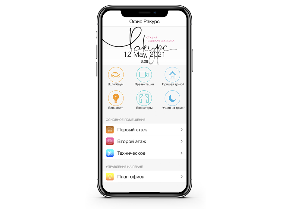 The “Leave office” scene turns off light, a contactor, closes blinds, closes the screen (if there was a presentation), turn the thermostat into an economical mode. The scene can be activated with the help of a button switch at the door (by holding a button).