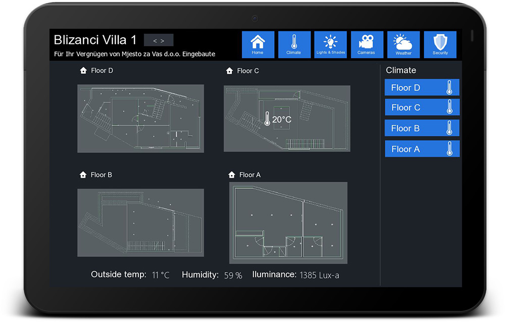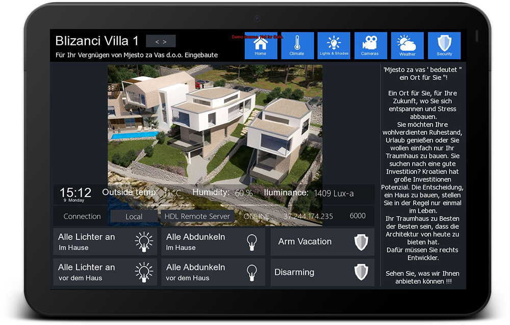 Investor needed solution that will provide superior lighting, curtain, AC, security system and video surveillance control and system integration with possibility of local and remote connection to the system. HDL buspro products has been selected for automation purposes and security system and Ubiquity UnifiVideo cameras and NVR for video surveillance.