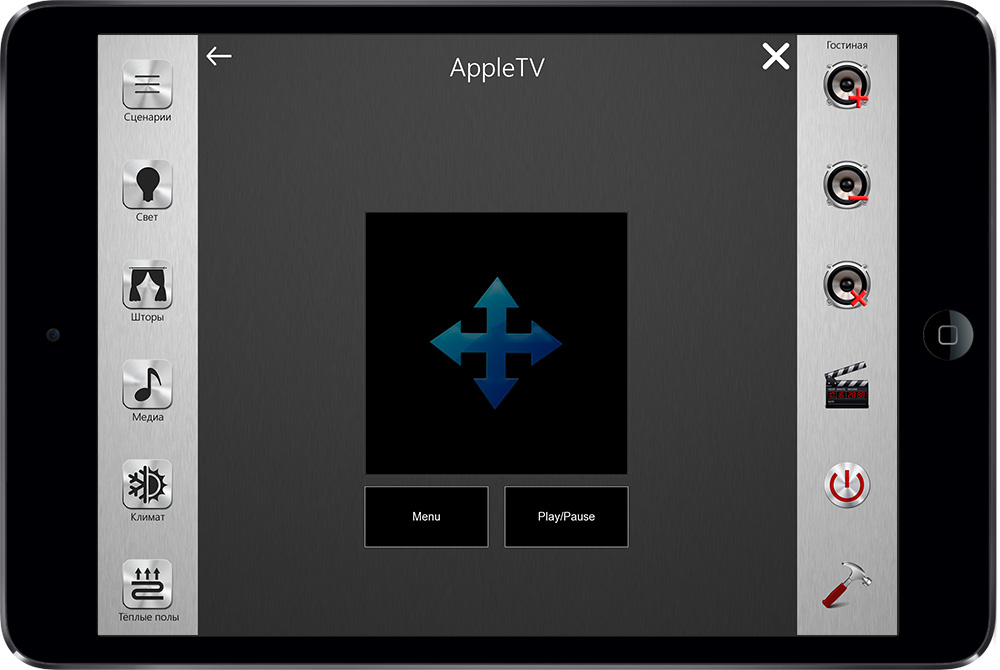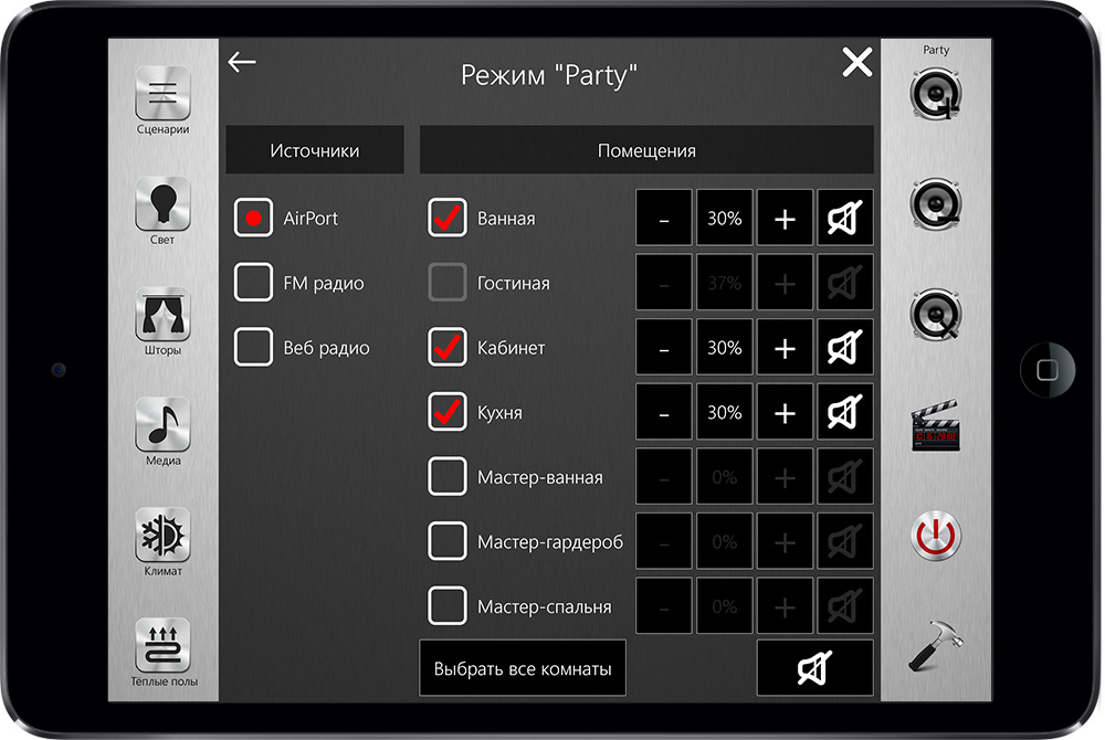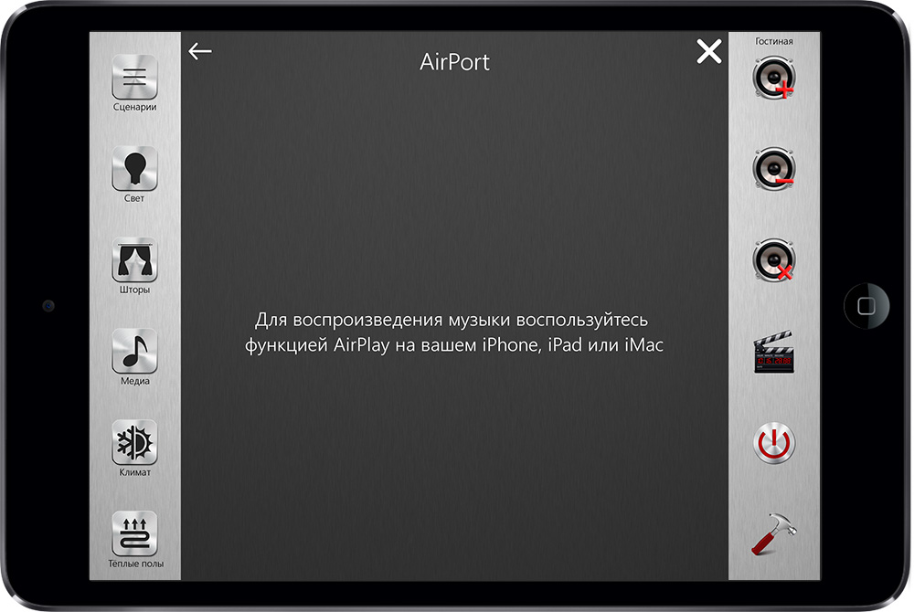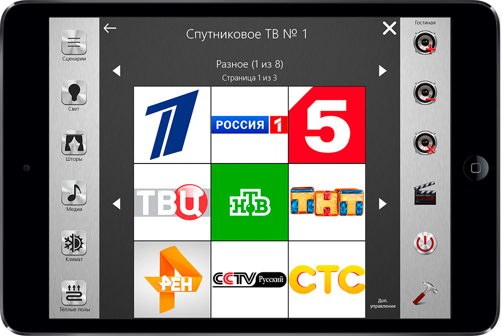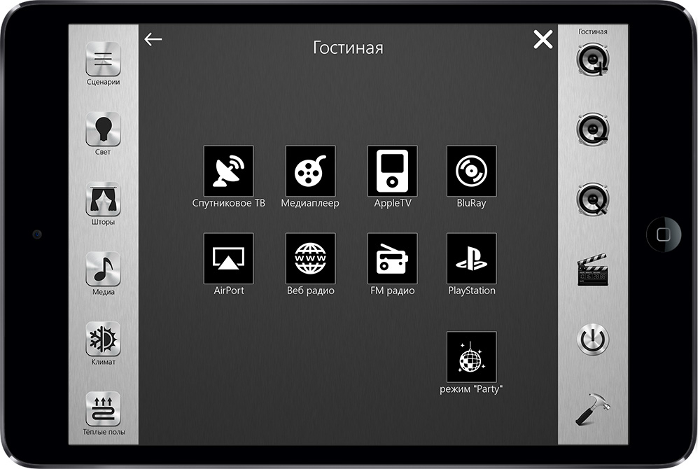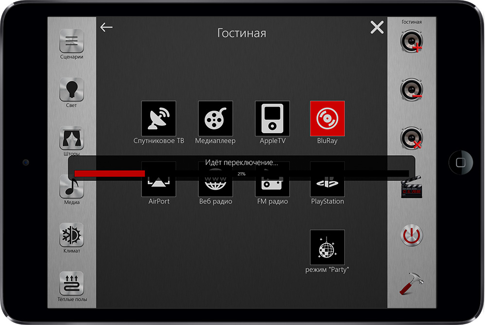 Control of all multimedia devices and TV-sets from one iPad. Control of sound adjustment for all rooms (high, low frequencies, balance) channel sound control for the sitting-room. A special algorithm of switching between sources provides minimal time of switching from one source of content to another