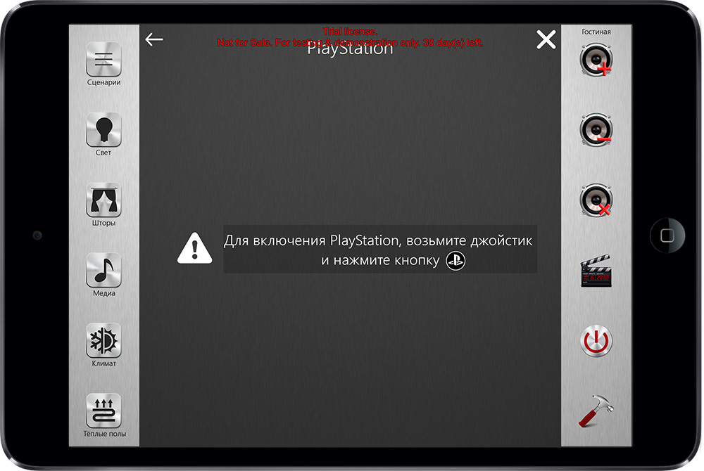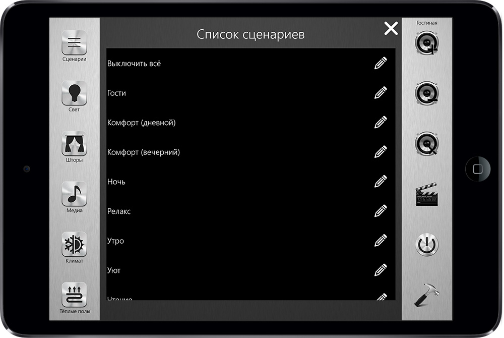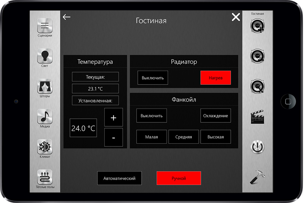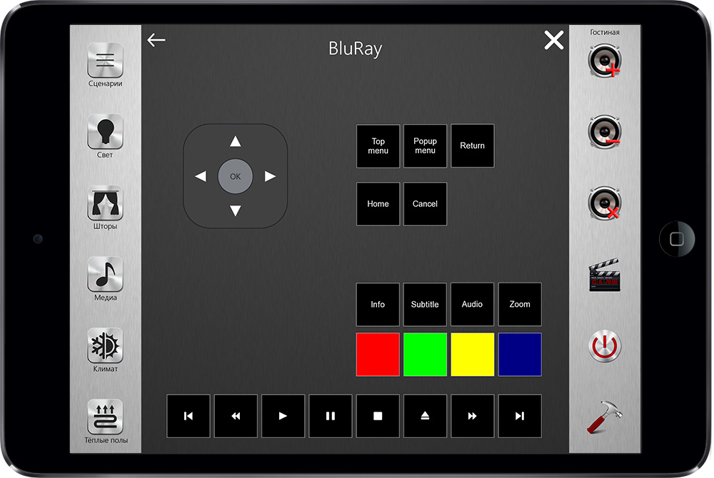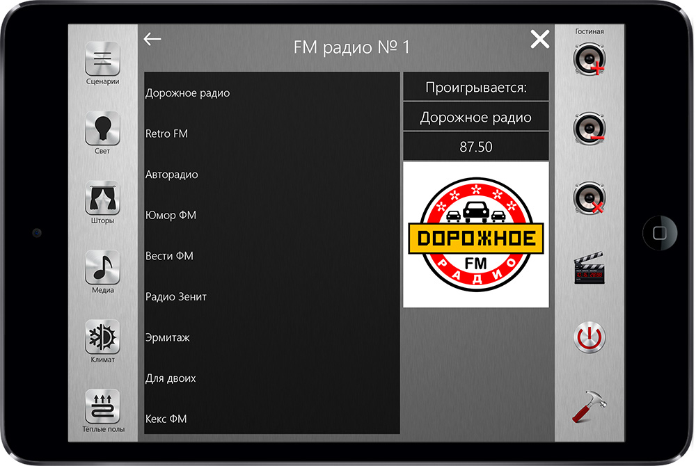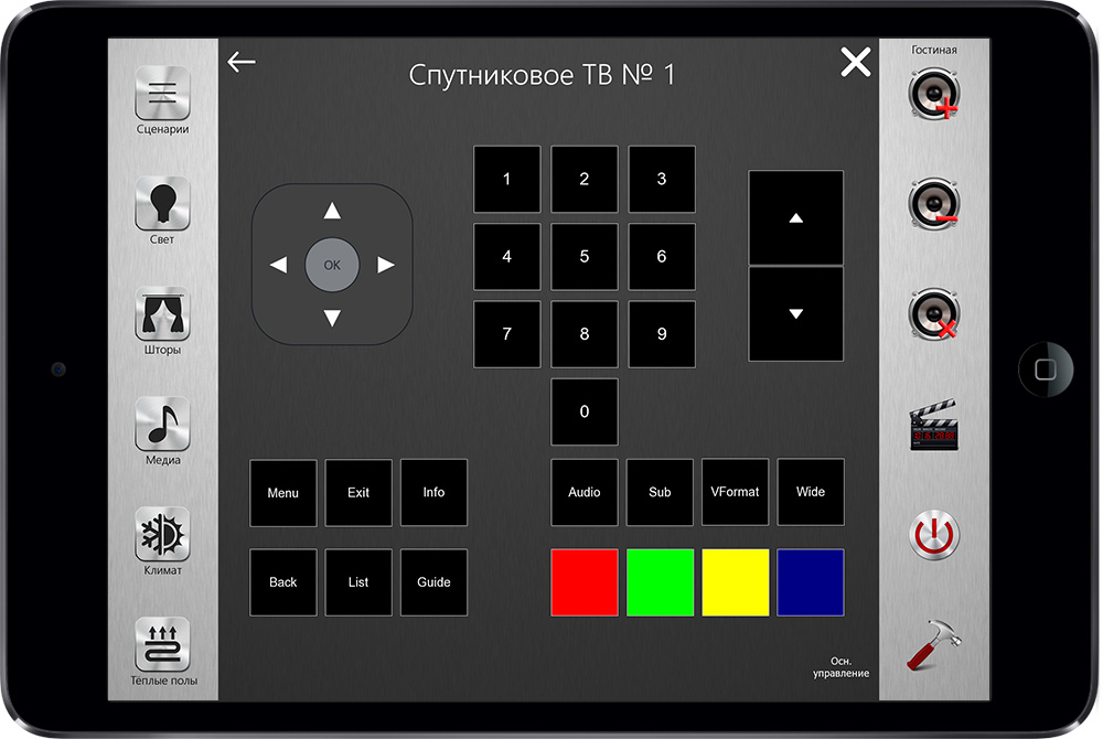Control of all multimedia devices and TV-sets from one iPad. Control of sound adjustment for all rooms (high, low frequencies, balance) channel sound control for the sitting-room. A special algorithm of switching between sources provides minimal time of switching from one source of content to another