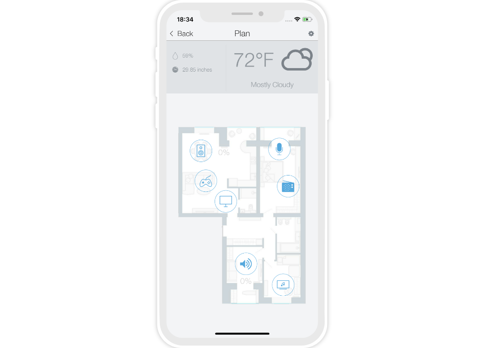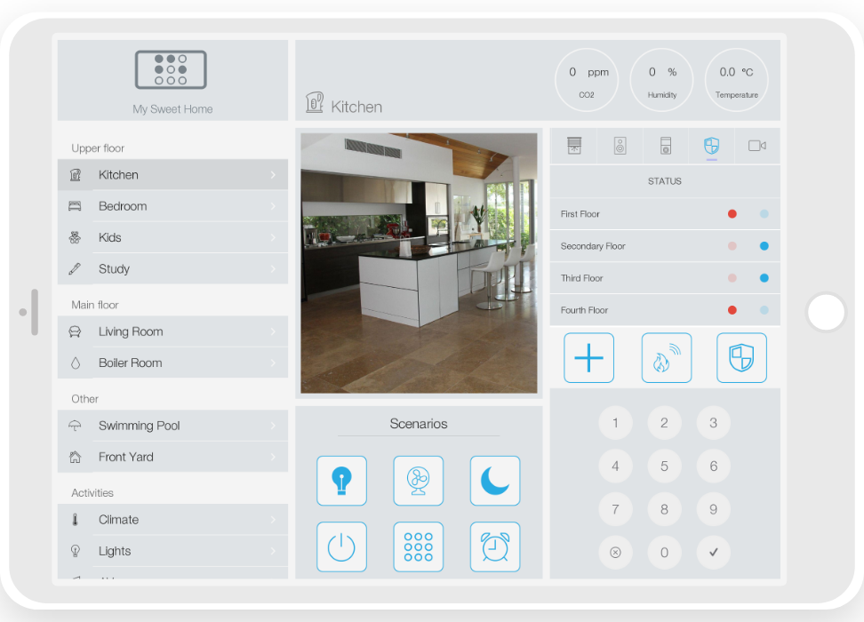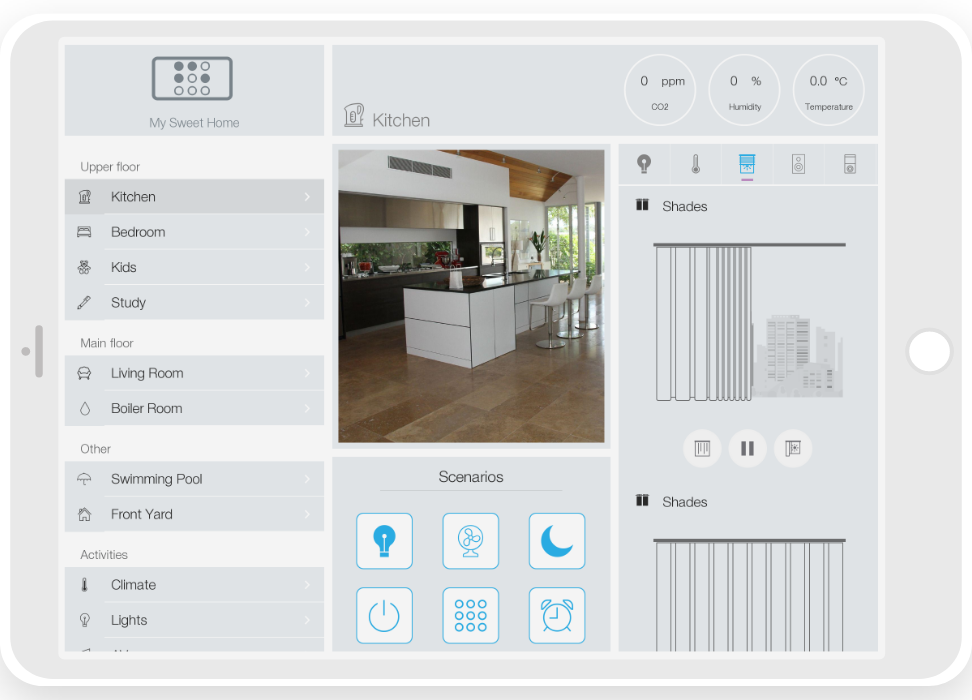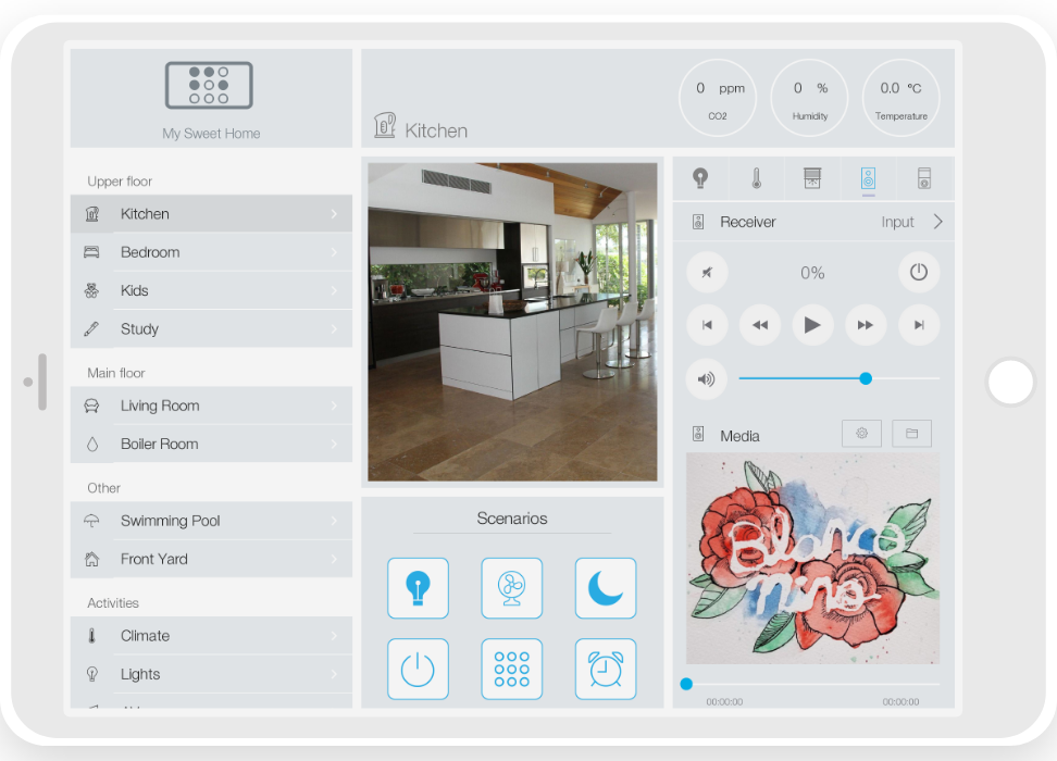 ready widgets to control light, blinds (with animation), cameras, climate, Audio/Video equipment, scenes.