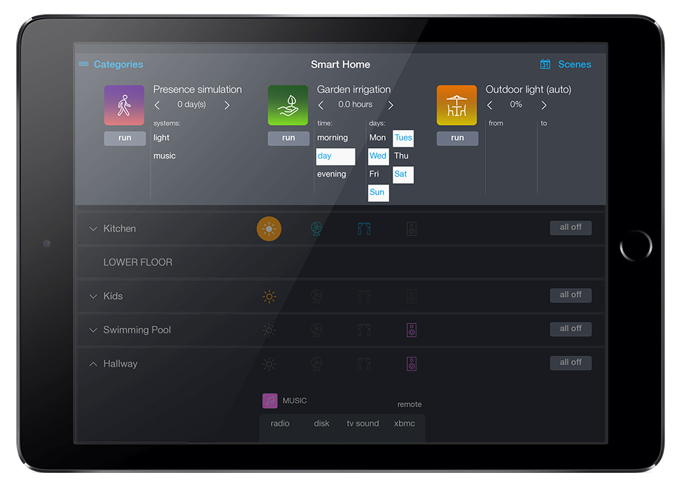 Navigation and logics of the interface is based on drop-down lists. It provides intuitive control of Smart home, office, apartment, home theater. The interface has two versions: Light edition and Dark edition.